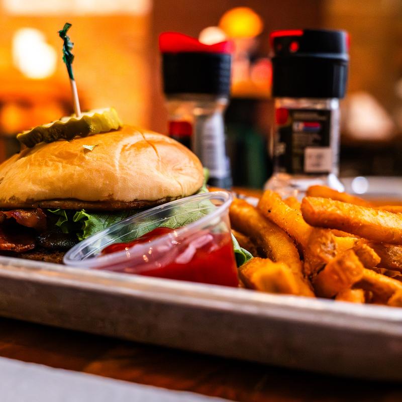 Our 6 oz handmade patty on a grilled Masada Bakery brioche bun with lettuce, tomato, ketchup, mustard, mayo, ketchup, and pickles with cheddar cheese and applewood smoked bacon.