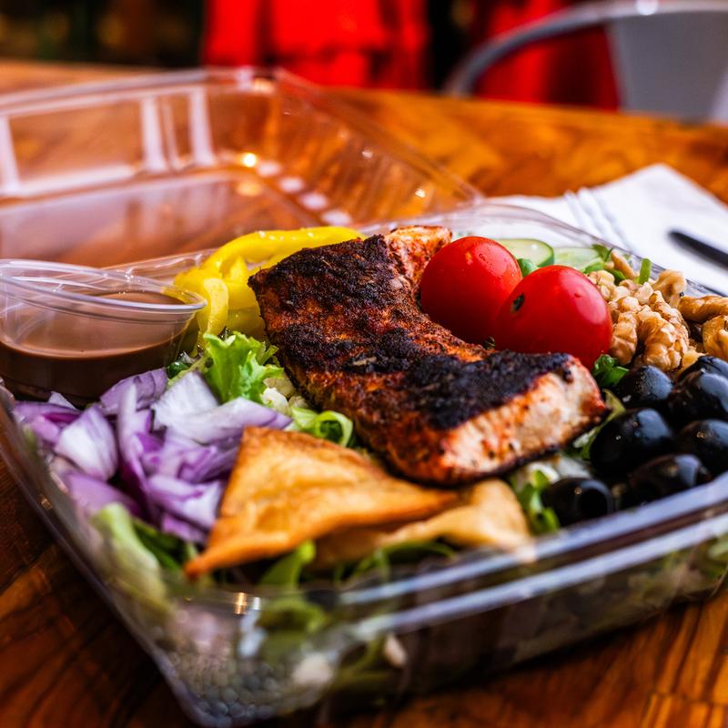 Grilled salmon on mixed greens, tomato, feta, cucumber, walnuts, onions, banana peppers, and black olives served on a slice of homemade pita chips with our 0 fat/0-calorie balsamic vinaigrette dressing.